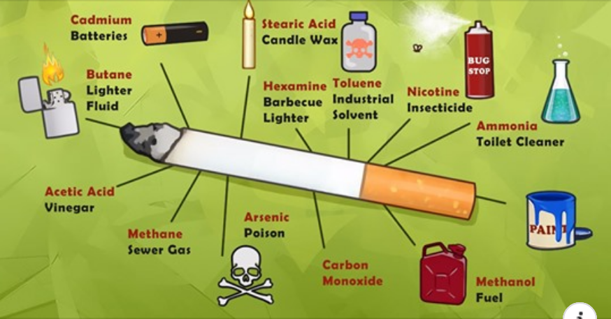 Los cigarrillos contienen cadmio de las baterías, butano del líquido del encendedor, metano del gas de alcantarillado y arsénico del veneno. También contienen amoníaco del limpiador de inodoros, metanol del combustible del cohete, hexamina de los encendedores de barbacoa y ácido esteárico de la cera de las velas. ¡Qué asco!